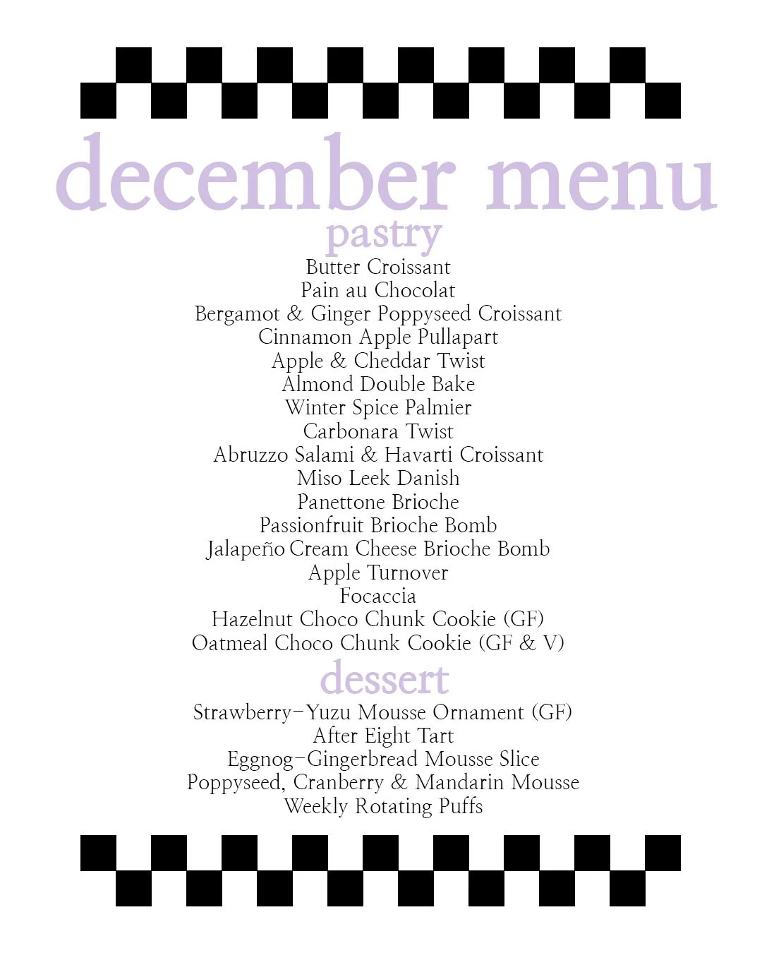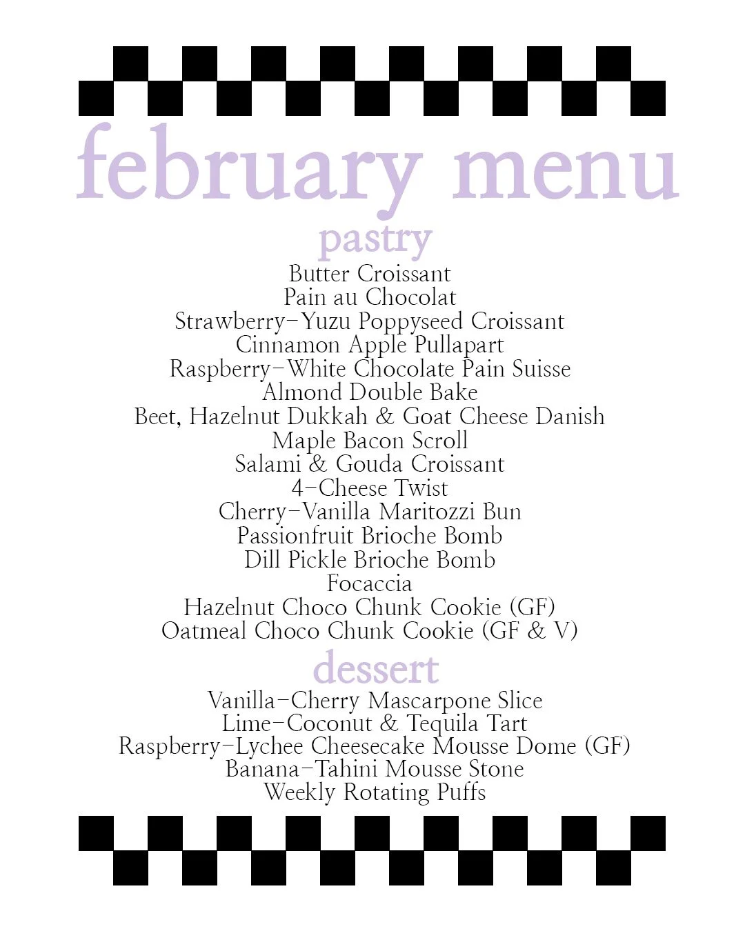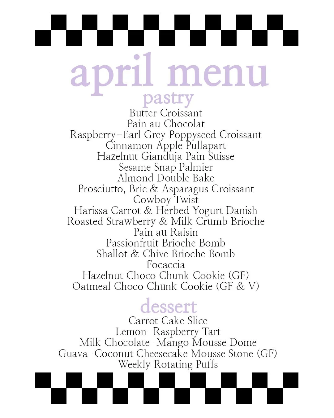 Butter Croisant, Pain au chocolat, Strawberry-Poppyseed Croissant, Apple-Cinnamon Pullapart, Pain au Raisin, Brulee Spiral, Almond Double Bake, Salami & Gouda Croissant, Camamelized Onion Thmye & Cheddar Twist, Brioche Buns, Hazlenut Chocolate Chunk Cookie (Gluten Free), Oatmeal Chocolate Chunk Cookie (Gluten free & Vegan), Baked Almond Raspberry Lychee tart, Caramel & Coffee Brownie, Neapolitan Tart, Vanilla-Lemon Blackberry Mousse dome, Puffs